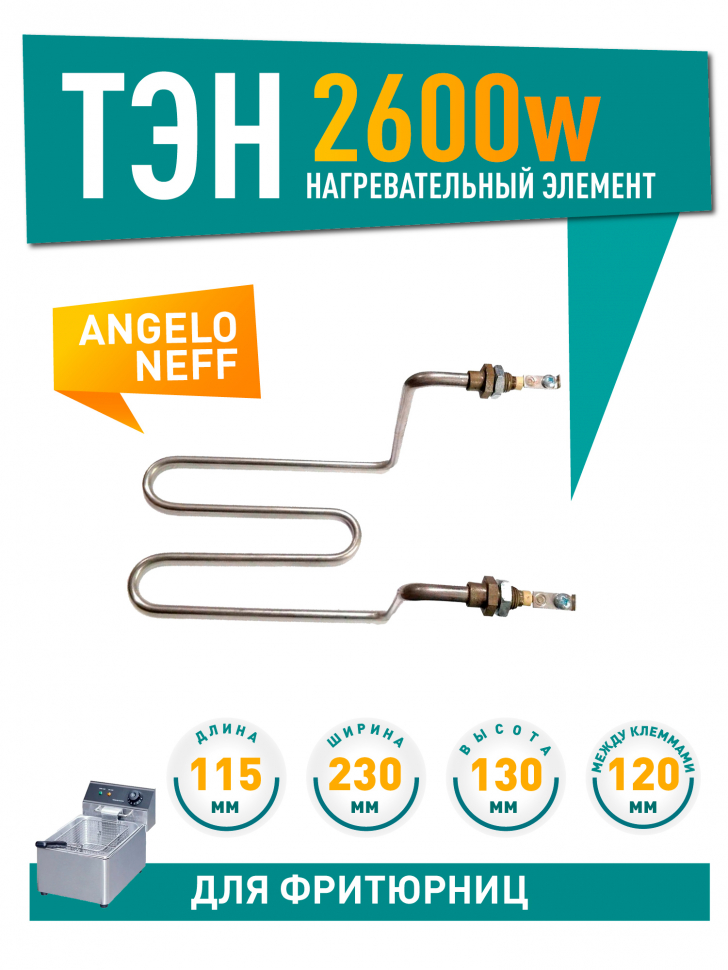 ТЭН фритюра для Angelo, Neff, 2600W, клеммы под винт, межосевое 120мм, L115х230х130мм, D8,5мм, 220V, 48261
